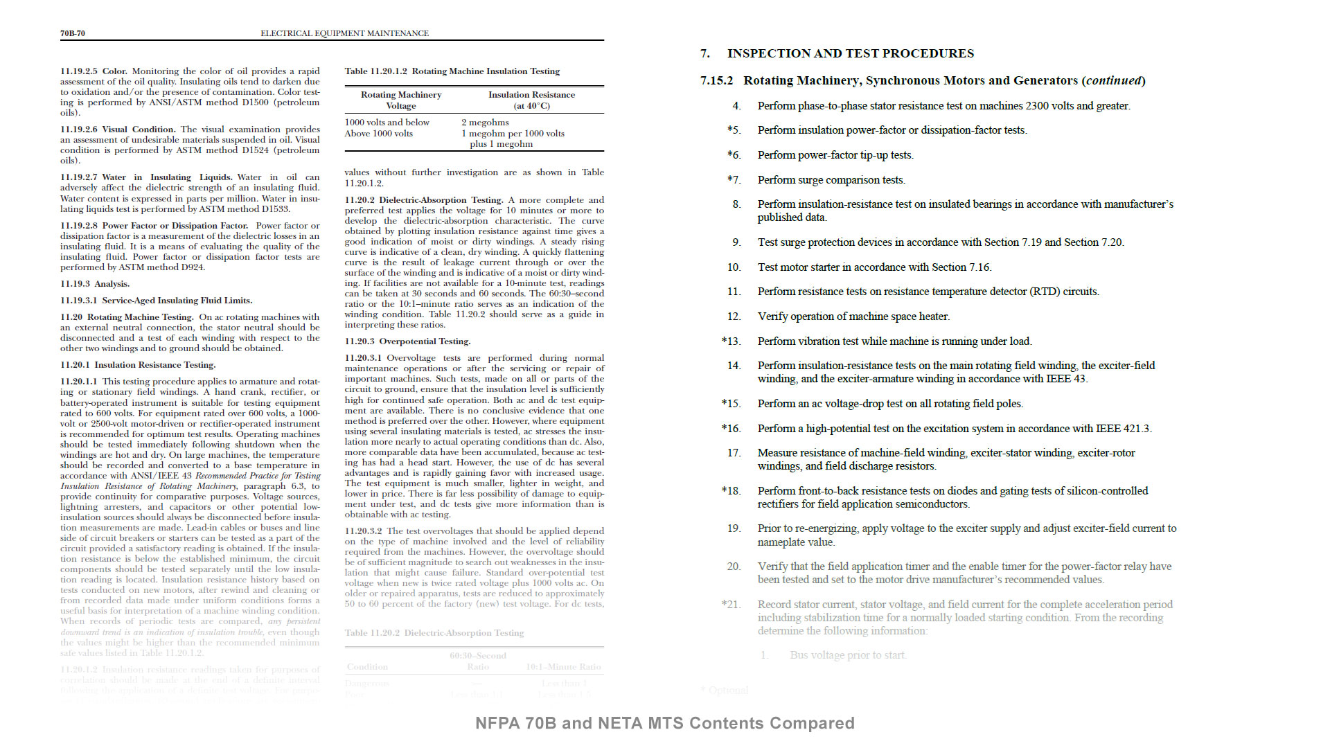 NFPA standards discuss the basic theory behind various tests, including an entire chapter on the fundamentals of electrical equipment maintenance. In total, 70B contains over 30 chapters on equipment ranging from the basics like transformers, circuit breakers, and rotating machines to more advanced situations like Electrical Disaster Recovery and Vibration Analysis.