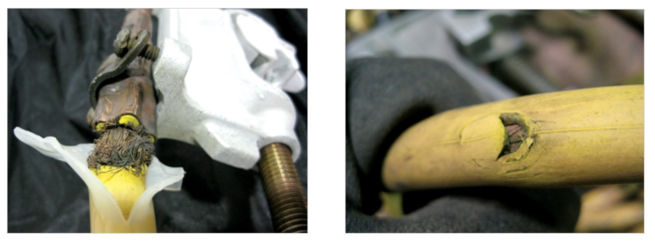 Ground cable assemblies should be visually and mechanically inspected before each use. Cables should be carefully examined to detect broken strands, corrosion, and other physical damage to the cable.